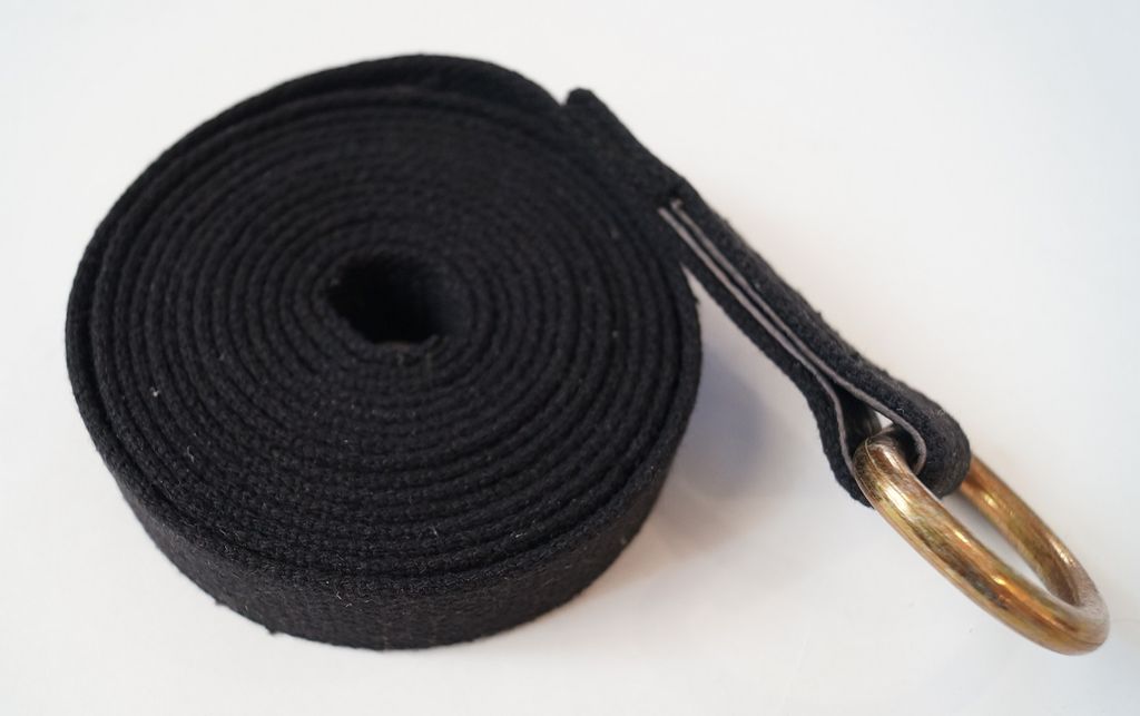 Изготовлен из ременной ленты шириной 2.5 см и длиной 2.4 метра. Крепление полукольца усиленно натуральной кожей.