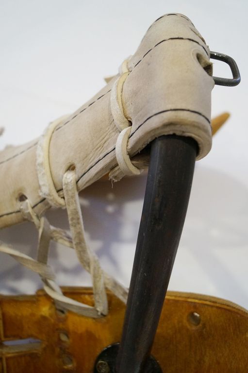 Ленчик для седла кавалерийского, основа (каркас) седла из дерева и металла. Окрашено защитным составом от природных условий. Ожиловка ленчика состоит из сыромятного живца, двух подушек(войлок, обтянутый кожей сыромятной) и сшивки сыромятной.