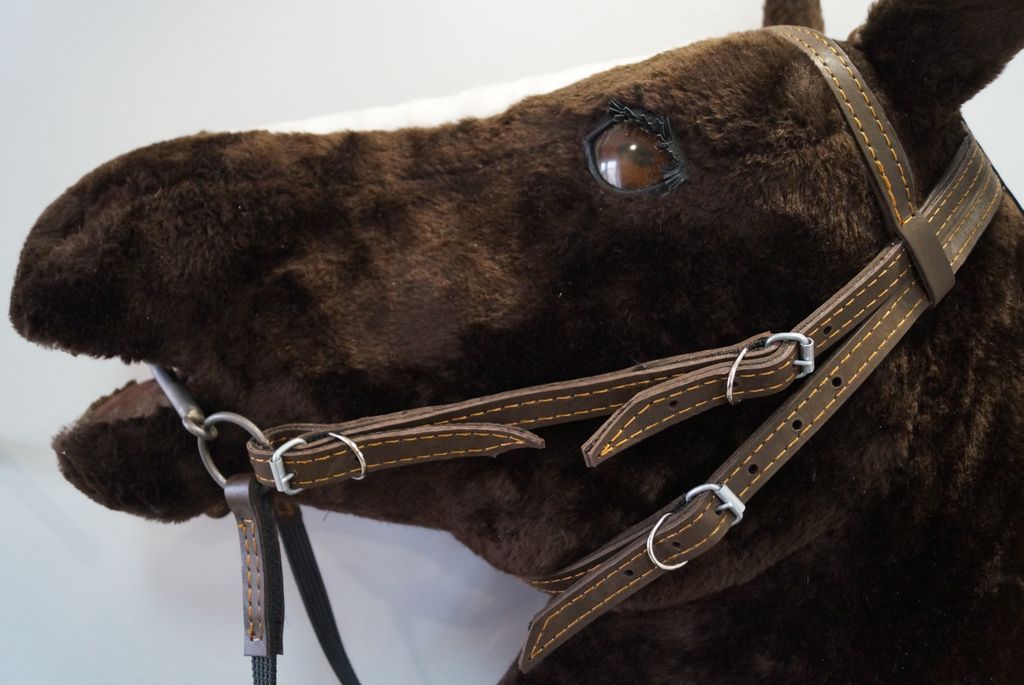 Узда из двух слоев натуральной кожи для дополнительной надежности прошита с капроновой лентой . Оснащена съемным трензелям ,регулируеться пятью пряжками из стали по размеру от COB до FULL. Идет с прочным ременным поводом (прорезинен) для управлением лошадью. Затылочный и налобный ремень имеют смягчающую подушку из натуральной (мягкой) кожи.