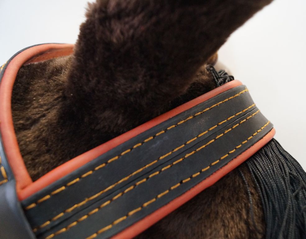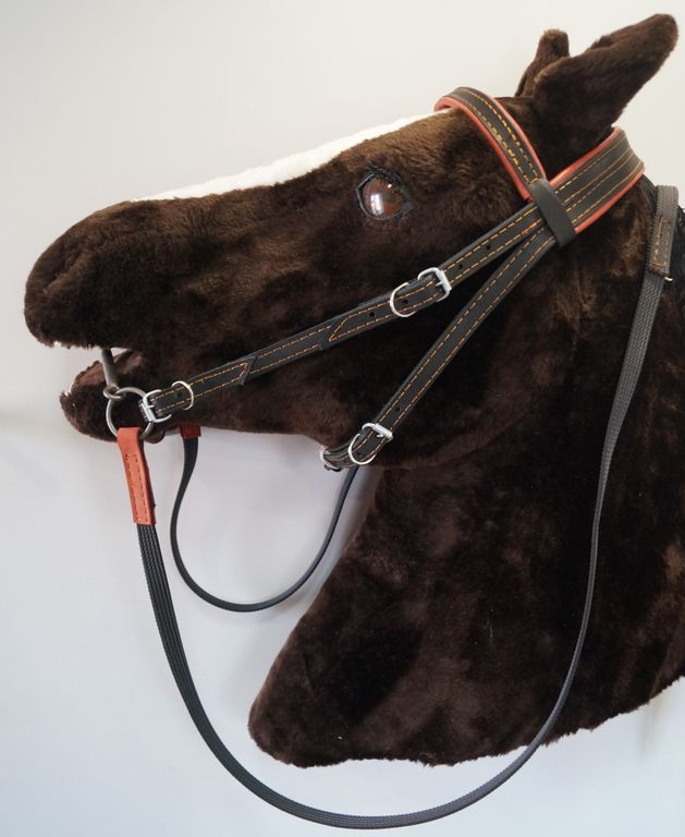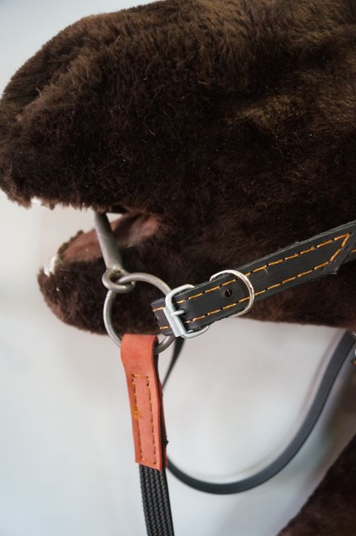 Узда из двух слоев натуральной кожи для дополнительной надежности прошита с капроновой лентой . Оснащена съемным трензелям ,регулируеться пятью пряжками из стали по размеру от COB до FULL. Идет с прочным ременным поводом (прорезинен) для управлением лошадью. Затылочный и налобный ремень имеют смягчающую подушку из натуральной (мягкой) кожи.